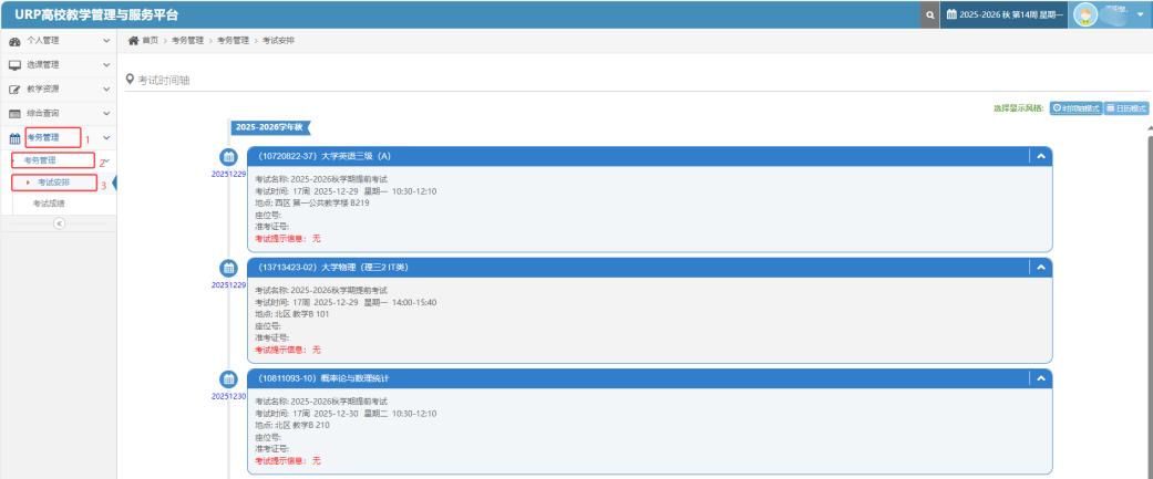 本学期期末集中考试通过我校URP综合教务管理信息系统安排。同学们自2026年1月5日起可登录我校URP综合教务管理信息系统(网址https://jwxs.tiangong.edu.cn,点击左侧考务管理--考试安排,具体如下图所示)查询2025-2026学年秋学期20周期末集中考试时间、考试地点等相关信息,提前做好考前各项准备。